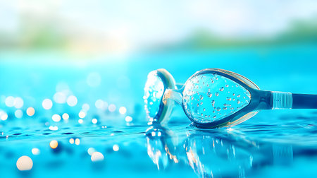 Goggles sit on the water surface, capturing sunlight and creating reflections in a bright pool.