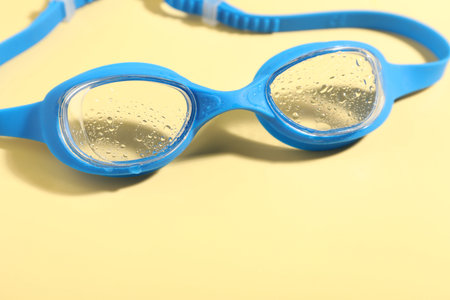 Swimming goggles with anti-fog coating on reflective wet surface against blue background