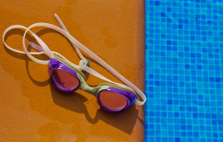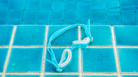 Close-up of a pair of swimming goggles resting on the edge of a pool, with calm blue water in the background, ideal for swim training visuals.