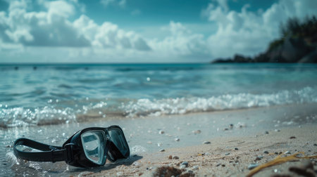 A pair of scuba diving goggles lay on the sandy beach, with azure waters and blue skies creating a picturesque natural landscape. Vision care eyewear for underwater adventures AIG50