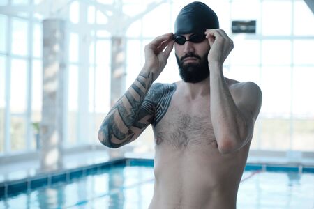 Brutal bearded swimmer with tattoo adjusting goggles while preparing for swimming training