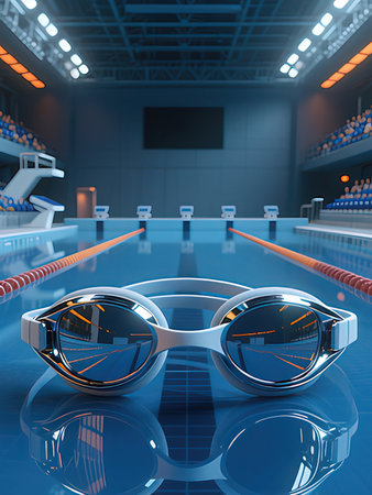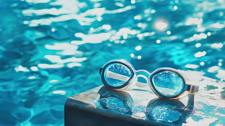 Pair of swimming goggles resting on a diving board, with blue pool water shimmering below, ideal for competitive swimming themes.