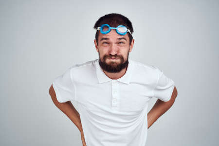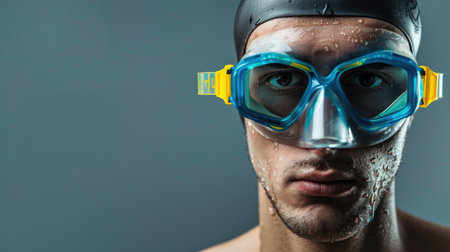 Portrait of a swimmer in a cap and mask, half-length portrait, young athlete swimmer wearing a cap and mask for swimming, copies of space, gray background