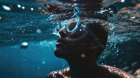 A dynamic underwater scene featuring a diver with snorkel gear swimming gracefully through clear blue water filled with bubbles, evoking a sense of adventure and freedom.