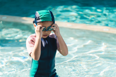 Asian boy wearing goggles and swimming in pool in sunny day.
