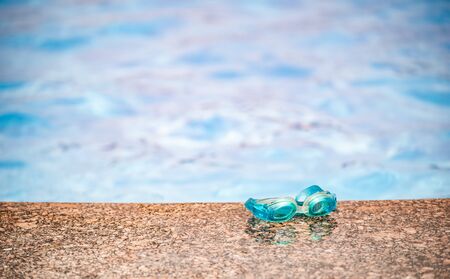 Close-up of waterproof children's swimming goggles lie on a wooden surface against the background of a blurred pool on a warm summer day. Concept of vacation with children at sea. Advertising space
