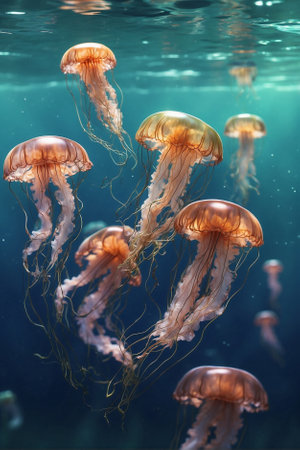 A group of jellyfish swimming in a blue ocean with green water, AI