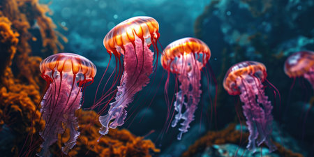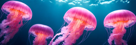Majestic Jellyfish Gliding Underwater in the Ocean.A graceful group of pink jellyfish floats through the tranquil blue waters of the ocean, illuminated by a soft light from above