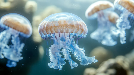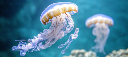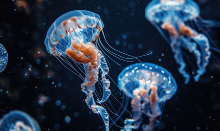 glowing jellyfish gracefully drifting underwater, their tentacles trailing in a deep blue oceanic backdrop.