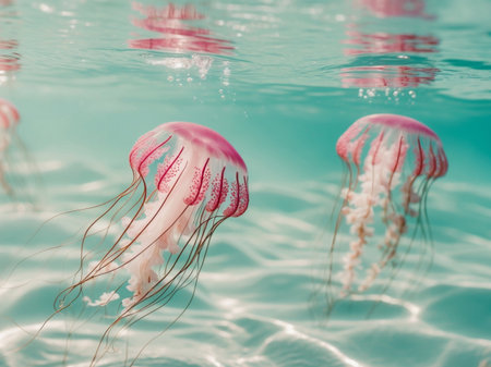 Underwater creatures exhibit their tranquil beauty as a group of jellyfish floats softly, their tentacles trailing elegantly in the clear water, capturing the sunlight above.