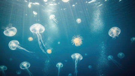 Numerous jellyfish float gracefully in the depths of the ocean, illuminated by shafts of sunlight. The image showcases a vibrant blue underwater environment with various sizes and shapes of jellyfish. It could be suitable for scientific publications, educational materials, or decorative purposes.