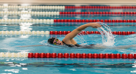 Female swimmer in cap and goggles swimming in pool at leisure center