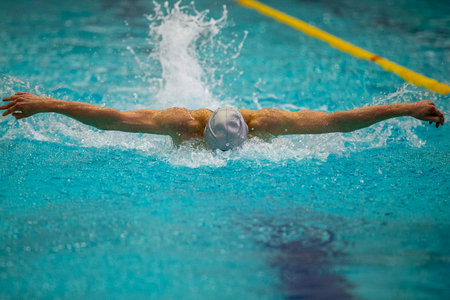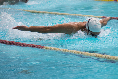 Man swims butterfly style in swimming pool