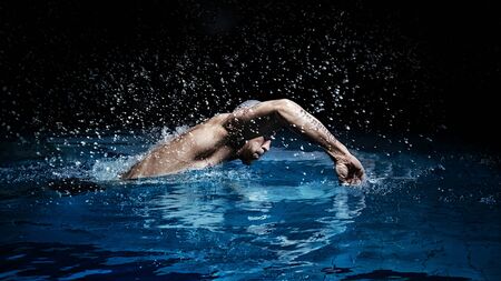 Swimming sports athlete swimmer swims in the pool, preparing for the race. Professional mens water sports for adults, engaged in cardio training in the water in the indoor pool. Panoramic banner.