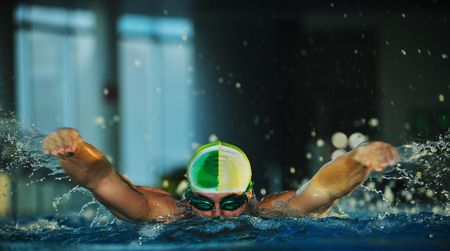 Swim competition swimmer athlete doing butterfly stroke in swimming pool