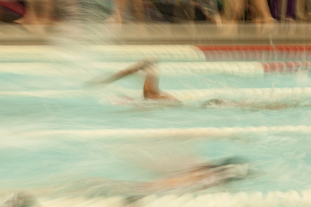 Young boy swimmers raceing furiously in freestyle stroke at a local pool