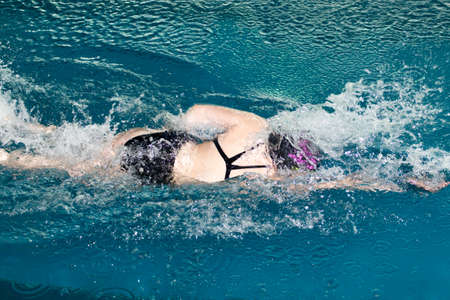Woman swimming with swimming hat and swimsuit in swimming pool