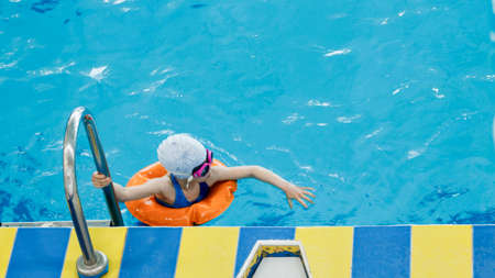 Asian little girl in a swimsuit swimming at the swimming pool