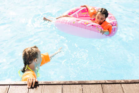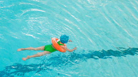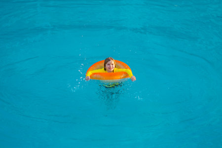 Summertime fun. Little kid swimming in pool. Kid in swimming pool. Kid relax swim on inflatable ring. Summer vacation concept.
