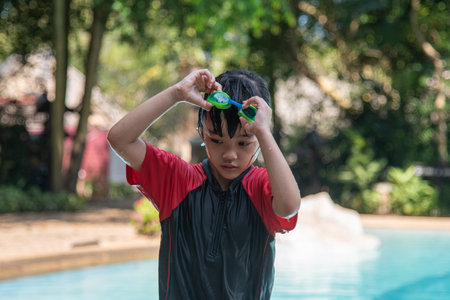 An asian boy touch a goggle to wear before swim