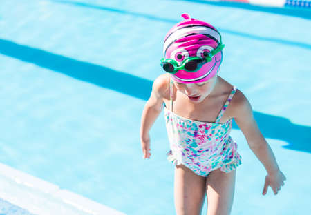 little girl smiling wearing swimming glasses in swimming pool. children playing in swimming pool on summer.