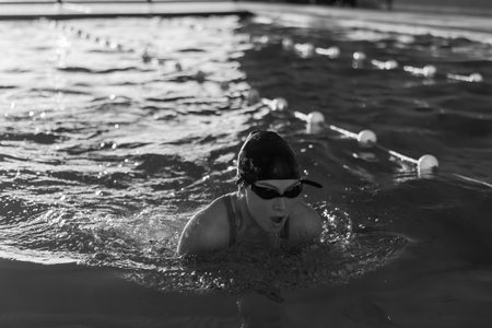 A girl practices her swimming technique in a pool, focused on her strokes and breathing, surrounded by lane markers and water ripples.