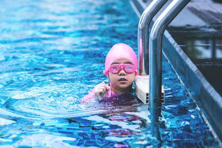 Little asian girl is swimming with glasses on the ladder