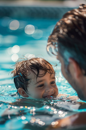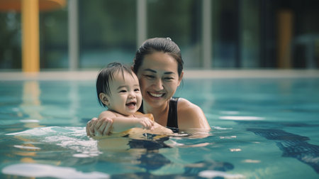Generative AI : healthy family mother teaching baby swimming pool