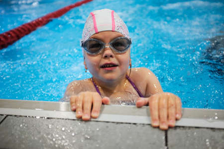 Cute preschooler girl bathing in the pool, learning to swim
