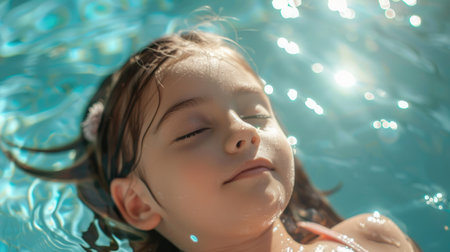 Little kid lying back on water in swimming pool, relaxing