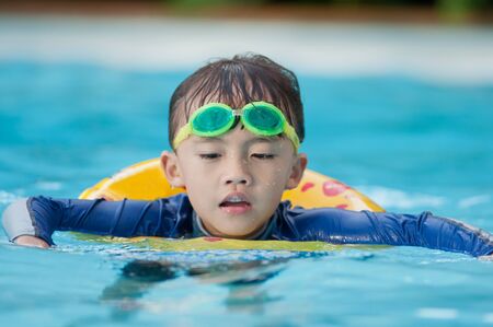 Portrait of Asian child swimming at the swimming pool.
