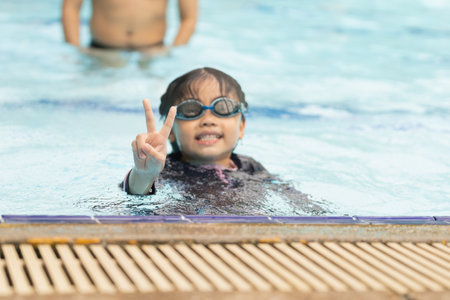 Asian young girl is in a pool, swimming and holding up her two fingers in a peace sign. She is smiling and she is enjoying herself