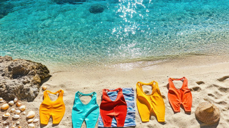 Colorful swimsuits arranged on a sandy beach, beside a beach towel, seashells scattered, crystal clear water in the background --chaos 30 --ar 16:9 --v 6.1 Job ID: afdc419e-a67e-4500-b766-fbb043eba9aa