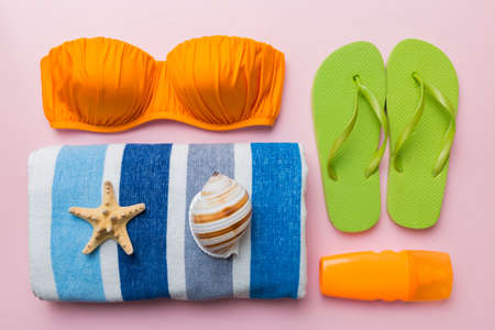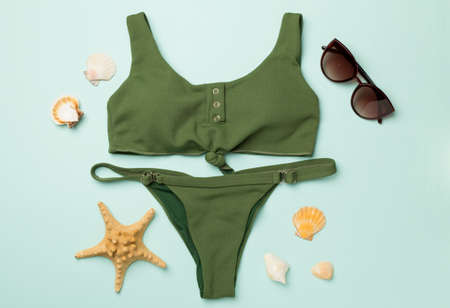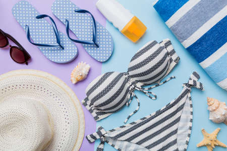 Summer fashion women swimsuit bikini, vacation concept, free space before text. Top view