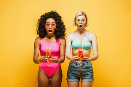excited interracial women in summer outfit holding cocktail glasses and looking at camera on yellow