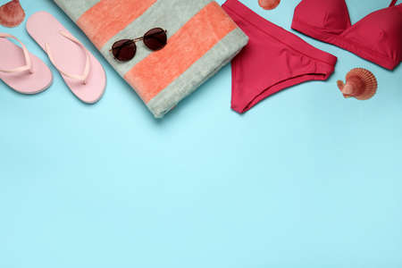 Beach towel, swimsuit, flip flops and sunglasses on light blue background, flat lay. Space for text