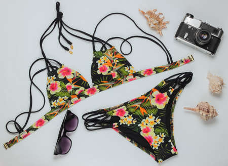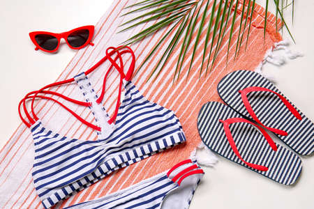 Woman's swimsuit and beach accessories on white background. Overhead view of woman's swimwear. Summer background, vacation on the beach. Flat lay, top view.