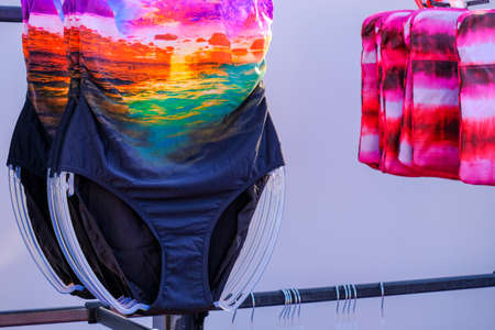 Women swimsuits in the retail store on Bali island, Indonesia. Fashion shopping concept in Asia.