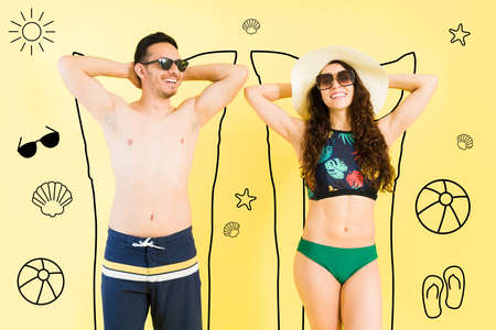 A pair of models in yellow and black swimsuit wearing sunglasses posing on the beach near the ocean.