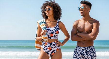 Beautiful young black woman posing in a swimsuit on the beach against the backdrop of sea waves. Generated by AI.