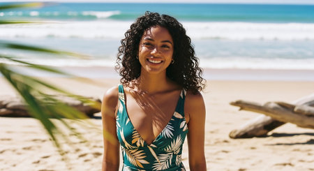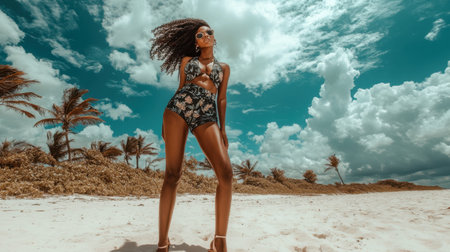 A confident young woman stands in a fashionable swimsuit at a beautiful beach, showcasing the perfect blend of summer style and tropical scenery under a dynamic sky.