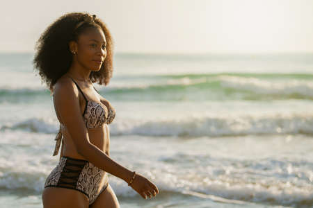 Beautiful Afro American woman in swimsuit is smiling while standing on the pier at the seaside