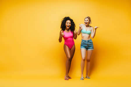 full length view of excited interracial women in summer outfit showing thumbs up while looking at camera on yellow