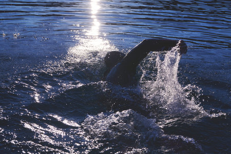 Triathlon swimmer churning up the water in the sea.. Athlete practicing for triathletic race in lak