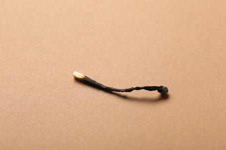 A single burnt matchstick stands upright with ash and smoke against a vibrant yellow background.