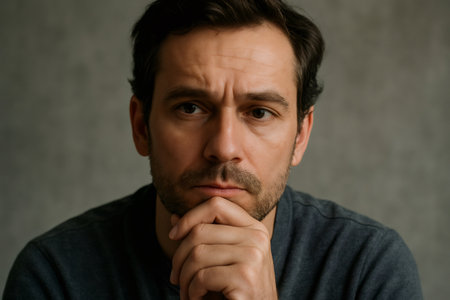 Close up portrait of a thoughtful man holding his chin, expressing deep contemplation and introspection against a gray backdrop