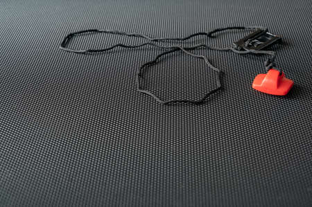 Focus on exercise equipment emergency stop laying on a treadmill belt