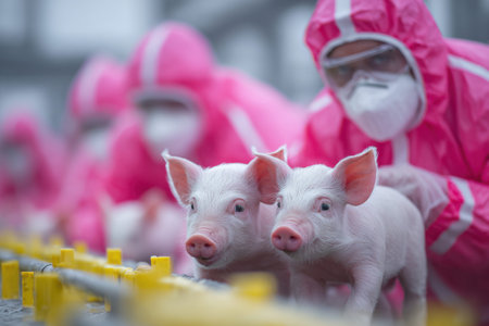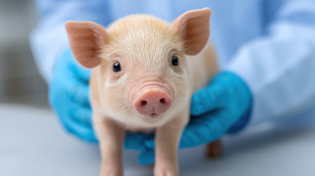 A charming piglet being gently held by a caring person in blue gloves, showcasing the importance of animal care and veterinary practices in agriculture.