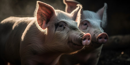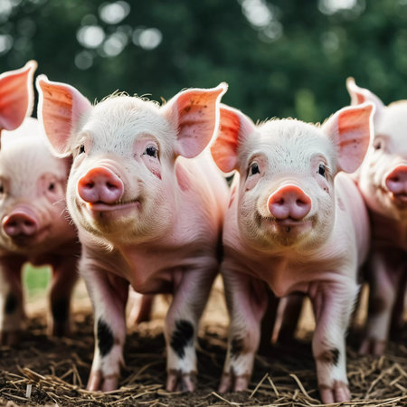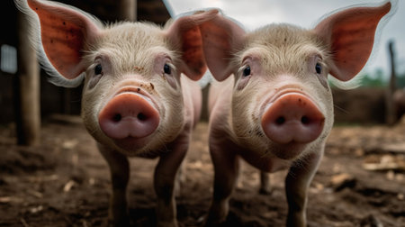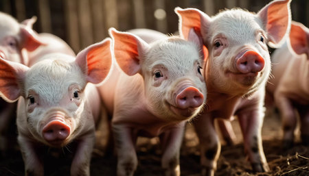 Adorable piglets stands together, their curious faces expressing playful energy under the warm sunlight. Playful nature in a sunny farmyard setting. Cute piglets gathered together. Generative AI.