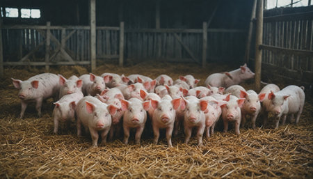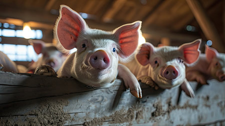 Pigs waiting feed,pig indoor on a farm yard. swine in the stall --ar 16:9 --v 6 Job ID: f3d6f071-74bc-4c67-b4ab-0e44ab38f85a